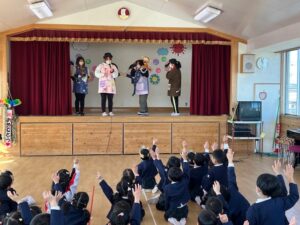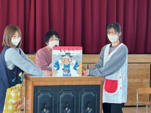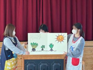 そして、今日のお楽しみは紙芝居。1つ目はなつき先生による「つよいぞ!ムテキッズ」。もう一つはみつき先生による「11ぴきのねことあほうどり」でした。みんな一生懸命聞いていました。
