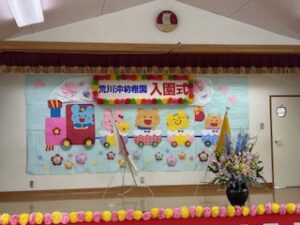 今日からみなさんは荒川沖幼稚園の園児です。幼稚園では楽しいことがいっぱい待ってますから、元気に登園してきてください。