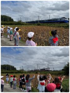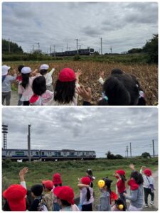 カンカンカンカンと踏切が鳴り始めると「キャ~」と線路の方を見つめる子ども達!列車が通過すると大きく手を振っていました!特急に普通電車、貨物等色々な種類の電車が見られました♪