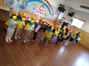 10月10日(金)年少組の保育参観がありました。お家の方の前で「ベイビーシャーク」のダンスを披露したり、歌を披露したりしました。