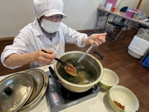 さくら組(年長組)は5月に作り、寝かせて完成した「味噌」を使って、「味噌汁」「味噌きゅうり」「味噌おにぎり」を作りました。