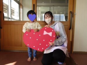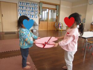 たんぽぽ組(2歳児)でバレンタインにちなんでハートのチョコのモチーフを持って写真を撮りました!子ども達同士でプレゼントしたりする姿が可愛いですね♪