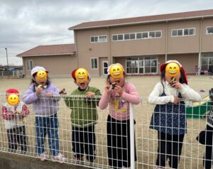 子ども達も待ちきれずフェンス越しに覗き「ちょうだい!」と次々にもらって熱々を食べます♪