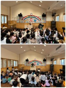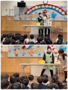 3月生まれの誕生会がありました。先生からの出し物は「何が落ちてくるかなゲーム」黒い箱の中から一瞬で落ちてくるものは何かみんな集中してみていました♪