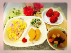 給食は「ひな祭りメニュー」ちらし寿司や菜の花の三色和えやすまし汁など春らしいメニューをいただきました♪