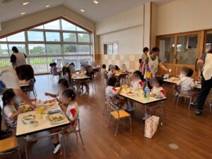帰って来てからは、千代田保育園のホールで一緒に給食を食べました!初めての交流でしたが子どもたちはとても楽しんでいました♪