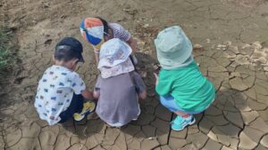 5歳児、4歳児が泥んこ遊びを行った畑が乾いて ひび割れパズルのようになっていました。興味津々の子ども達!思い思いに崩したりハメたりしながら楽しみました♪