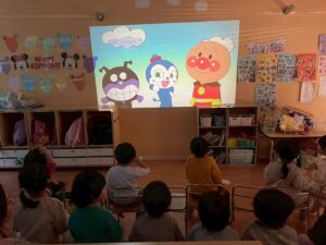 「これからアンパンマンの映画を上映します。チケットをお持ちの方はゆりぐみシアターまでお越しください🎤」