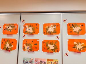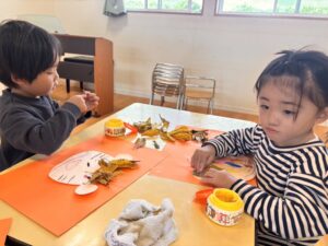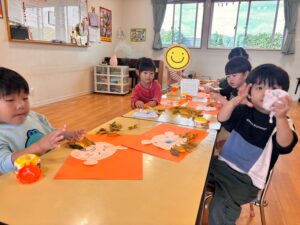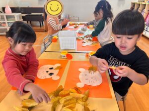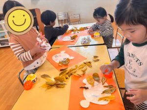 落ち葉をのりで貼るのがなかなか難しそうでしたが、みんな苦戦しながらも一生懸命貼りつけていました😊