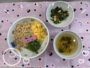・竹輪のすまし汁みんなの大好きな三色丼、今日は節分なので鬼のかまぼこをトッピングしました🤏