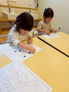 豆まきの後、鬼さんのシール貼りを取り組むちゅうりっぷぐみさん🤏