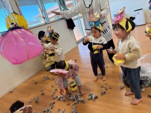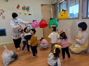 集会の後は豆まき!!みんなの中にいる「おこりんぼ鬼」「イヤイヤ鬼」「泣き虫鬼」を豆をまいて追い払いました👹