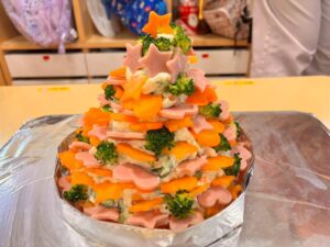 前日にさくらぐみさん・ゆりぐみさんが型抜きをしてくれたハムや人参で飾り付けしたクリスマスツリーサラダ🎄