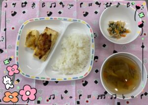 じゃこのでカルシウムと野菜のビタミン、わかめのミネラルが一緒にとれる和え物です。青梗菜のスープは、青梗菜の芯が柔らかくて美味しいスープです❤