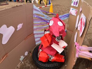 子どもたちの発想から、お菓子ゾーンや恐竜ゾーンなどのエリアもある、すみれぐみオリジナル迷路になりました😊