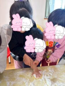 もち米を臼と杵を使ってぺったんこぺったんこと交互に。各クラスもち米の触感を手で触り、手で丸めてみたりと普段なかなかお家で出来ない事みんなで体験できました。