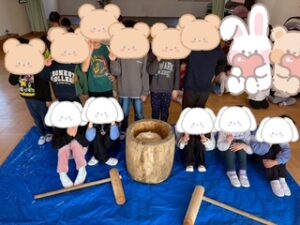 一足はやいお正月イベント、もちつきを行いました!場所はホールにて。もち米は給食先生に蒸して頂きスタートです。いつも食べているお米からは出来ないこと。どうしてお正月におもちを食べるのか?などをお話しました。