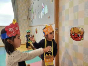 3歳から5歳のクラスは、豆まきの由来や作品紹介・鬼の紹介を室内で行いました。
