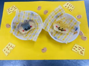 下の顔の部分はプレーン味、上の髪の毛の部分はさつま芋パウダーと南瓜パウダーを使用して二種類作りました。