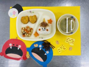給食は【・鬼さんおにぎり・チキンナゲット・大豆の五目煮・じゃが芋の味噌汁】を作りました。