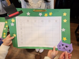 プレゼント交換では、ゆりさん・すみれさんがさくらさんに鉛筆たてと時間割表をプレゼントしました✨