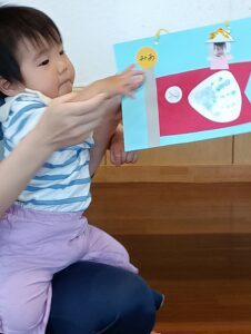 0歳から2歳児クラスも、作品紹介や鬼の説明をして、壁に貼ってある鬼に向かって新聞紙の豆を投げました。