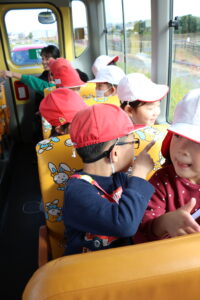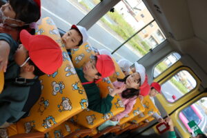 バスに乗るとワクワクの子ども達!外の景色を楽しみながらお友達と話をして楽しんでいました😊