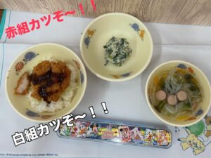 いよいよ運動会目前。10月に入っても真夏日に近いような暑い日があったりしますが、みんな張り切って練習に励んでいます。その気持ちに応えようと給食室では運動会直前「カツぞ~‼」の気持ちを込めたお楽しみ給食を用意してくれました。おやつにはメダルのクッキー。気持ちの準備は万端です。