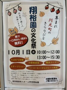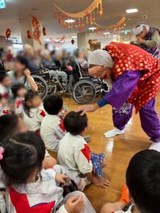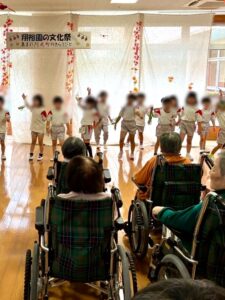 10月1日、年中さんが園の近くにある特別養護老人ホーム翔裕園さんの文化祭に参加させていただきました。はじめて園の外で披露する踊りにみんな大張り切り。たくさんのおじいちゃんやおばあちゃんに踊りや歌を披露して喜んでいただくことが出来ました。そのあと阿見町君津芸能保存会の皆様によるひょっとこ踊りも見学させていただきましたが、はじめてみたひょっとこに泣き出してしまうお友だちもいたりして‥‥‥ 貴重な体験でした。翔裕園の皆様、ありがとうございました。