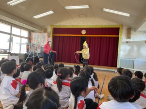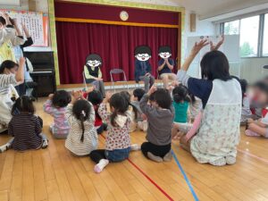 先生たちからこどもの日・端午の節句についてお話と紙芝居のプレゼント。クイズにも大きな声で答えてくれていました。お話もみんな静かによく聞いてくれました!