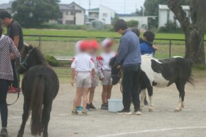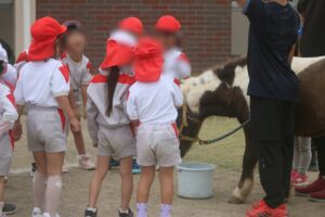 10月14日(月)、阿見町にある乗馬クラブSTABLE AMIEST(ステイブル アミエスト)さんのご協力により、ポニーと触れ合う楽しい時間を過ごしました。お話を聞いて優しくポニーに触らせていただいたり、年長さんはポニーに乗せていただいて園庭を一周する体験をすることができました。みんな可愛らしいポニーに大興奮!