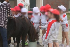 5月21日(火)、ポニー3頭がこども園に遊びに来てくれました。みんなでポニーににんじん🥕をあげたり、撫でたりしました。最初は怖がっていたお子さまもだんだんに慣れて、先生に手伝ってもらいながらポニーと仲良しになれたようです。