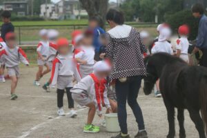 5歳児クラスは全員がポニーに乗って園庭を一周しました。なんだか誇らしげな表情がとてもかわいらしかったです。