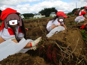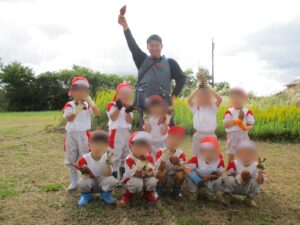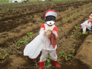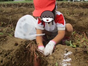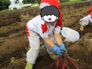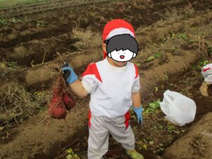 10月17日(金)、さわやかな風が吹く秋空の下、お芋ほりに行ってきました。前日の雨で畑がぬかるむ心配もしていましたが、阿見町農業委員会のご協力により、とても良い環境でお芋ほりを楽しむことが出来ました。年少さん、年中さんも頑張ってお芋を掘り、袋が破けるほどいっぱい収穫することが出来ました。年長さんはさらに多くのお芋を掘った上に、袋の入れ方も上手で、山盛りになった袋を一生懸命運ぶ姿がたくましかったです。阿見町農業委員会の皆様、大変お世話になりました。ありがとうございました。