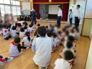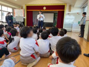 11月4日(火)、阿見町教化員さんと牛久警察署の方に来ていただき、防犯教室を行いました。お話や楽しい寸劇を通して、子どもが犯罪に巻き込まれないための防犯標語「いかのおすし」について学びました。手錠や警棒を見せてもらったり、恐々触らせていただきました。「いかのおすし」の意味、しっかり覚えられたかな?おうちの方に教えることが出来たかな?