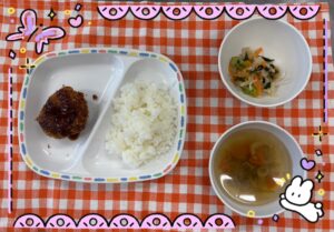 小松菜の胡麻和えは、砂糖、醤油、すりごまで和えます。子どもたちが食べやすいよう甘めの味付けです。